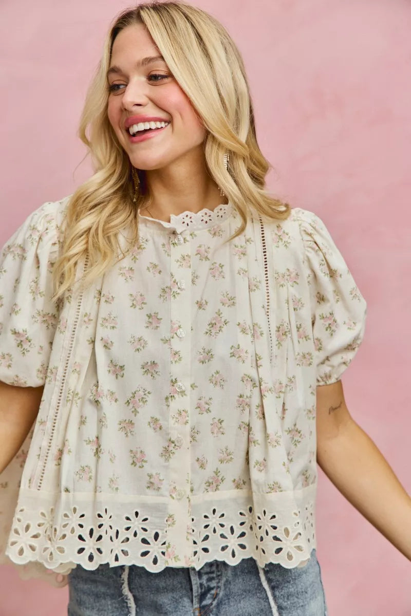 SO ME Floral Print Lace Trim Short Sleeves Blouse