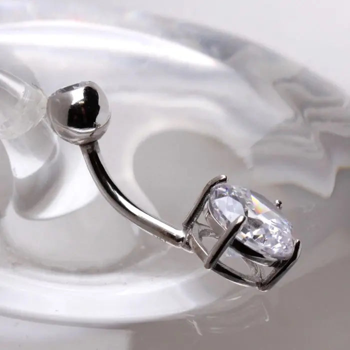 Add sophisticated elegance with this luxurious 14Kt White Gold Navel Ring featuring brilliant prong-set cubic zirconia stones. Crafted from genuine solid 14 karat white gold and stamped for authenticity, this belly button ring offers both modern beauty and hypoallergenic comfort for those who demand the finest quality body jewelry.