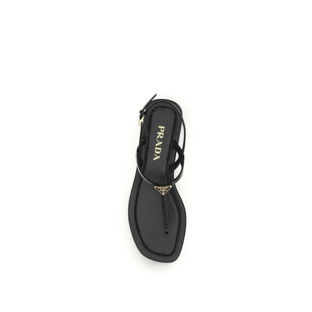 The leather flip-flop Sandals by Prada are crafted from patent leather and embellished with the iconic metal triangle logo on the instep. They feature an adjustable ankle strap closure and a round toe for optimal comfort. The logo printed on the inside adds a distinctive touch of elegance. Perfect for those looking for refined style and versatile footwear for any occasion.