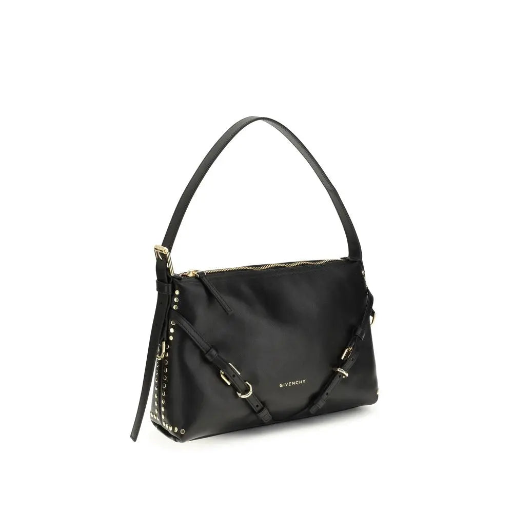 The Voyou Shoulder Bag by Givenchy features a soft V-shaped silhouette and generous volume. The adjustable shoulder strap allows it to be carried by hand, shoulder or crossbody, ensuring maximum versatility. The brand’s signature is stamped on both the front and top of the bag, while engraved metal clasps and gold-tone finish details complete the design with elegance.