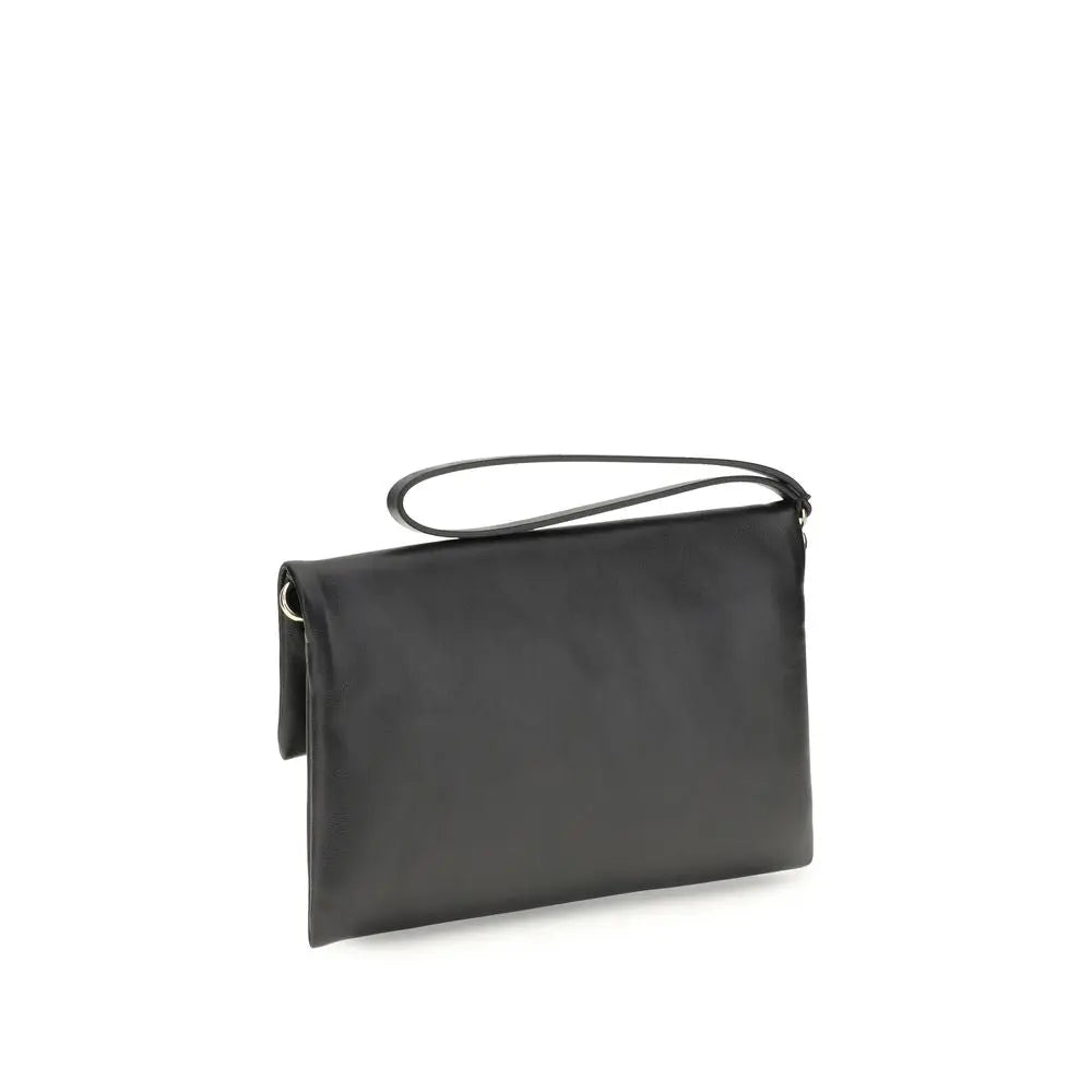 The Mamma Baguette Clutch Bag by Fendi is an elegant accessory crafted from soft black nappa leather, featuring a soft flap decorated with the FF closure and a tone-on-tone leather insert. The interior is lined to ensure perfect organization. It can be carried by hand thanks to the comfortable leather wrist strap, or worn over the shoulder with the removable chain shoulder strap. The gold-finish metal accessories add a touch of luxury and sophistication, making this clutch a chic and versatile piece, suitable for any occasion.