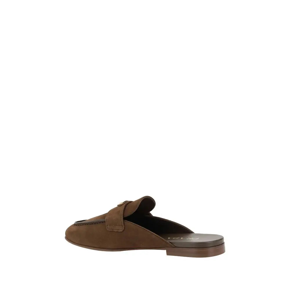 Prada’s suede Mules is an elegant loafer style open at the heel with a round toe. The iconic triangular logoed plaque is applied to the front, adding a distinctive detail. The slight block heel and logoed insole complete the design, combining comfort and style in a sophisticated and versatile accessory.