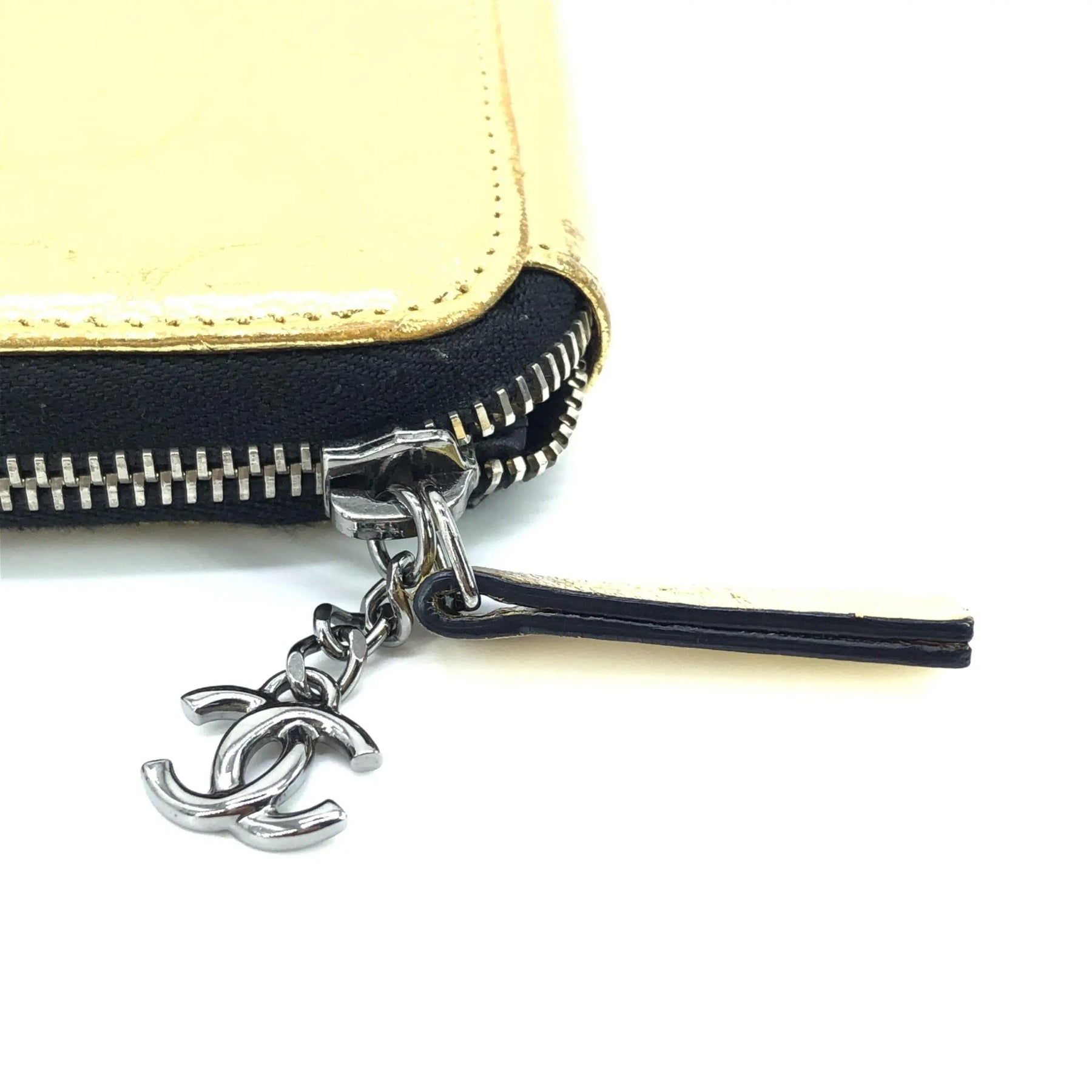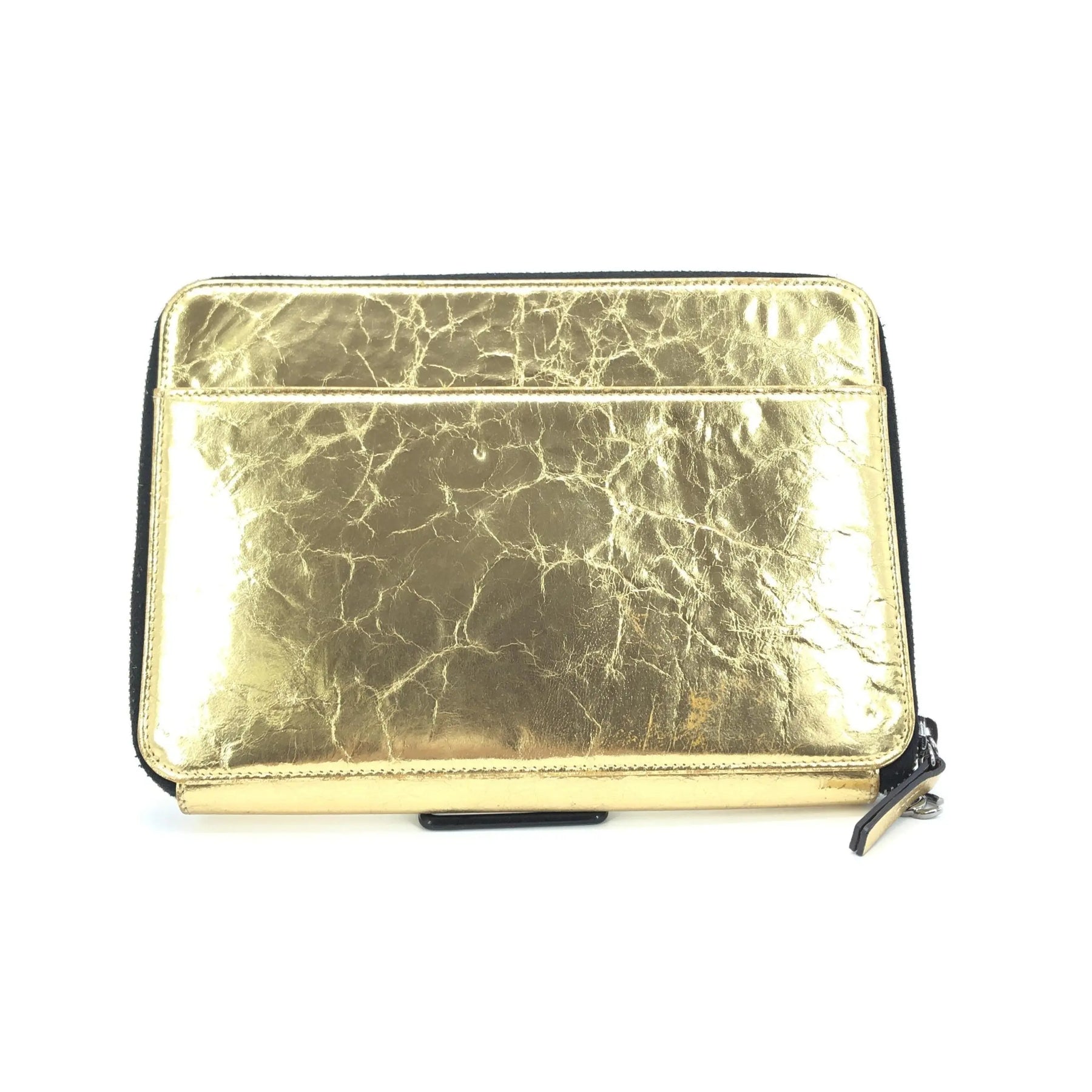 Introducing the exquisite Chanel Gold Tone Votez Coco Zip Clutch, a timeless piece that embodies elegance and sophistication. Crafted with meticulous attention to detail, this clutch is graded AB, indicating its excellent condition. The exterior showcases minor wear, adding a touch of character to its luxurious gold tone, while the interior remains pristine with no visible signs of wear or use.