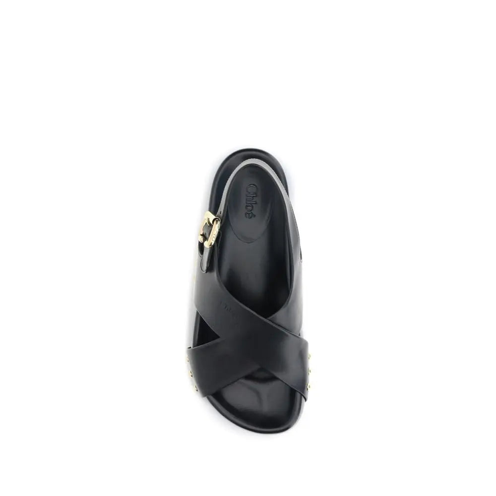 The Mae Sandals by Chloé, crafted from smooth calfskin, combine elegance and comfort thanks to the anatomical insole designed to last all day. The upper is characterized by crossed straps and an adjustable ankle strap, secured by the iconic Paddington buckle. The gold studs and the embossed Chloé logo add a distinctive touch, completing with refinement these sophisticated sandals.