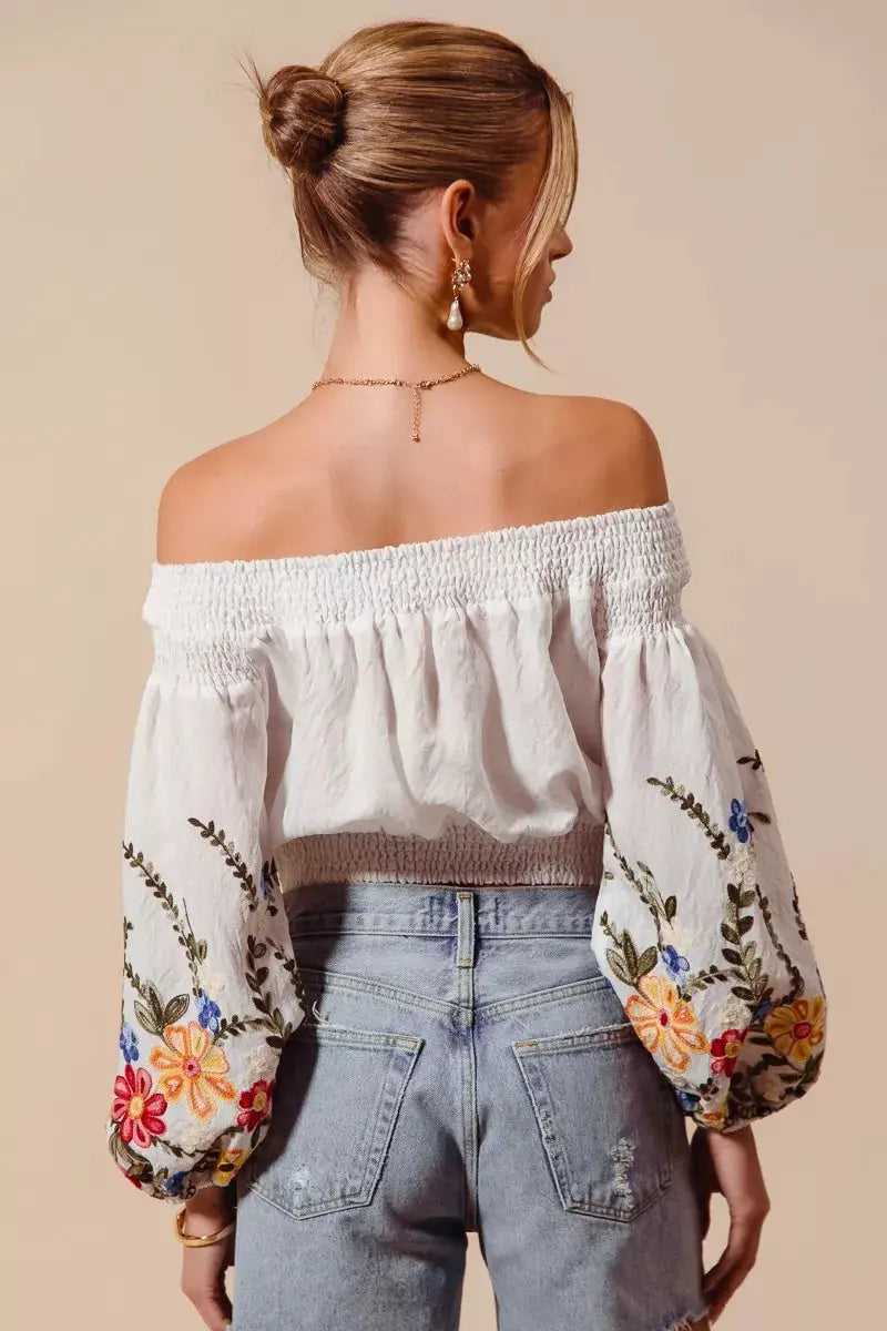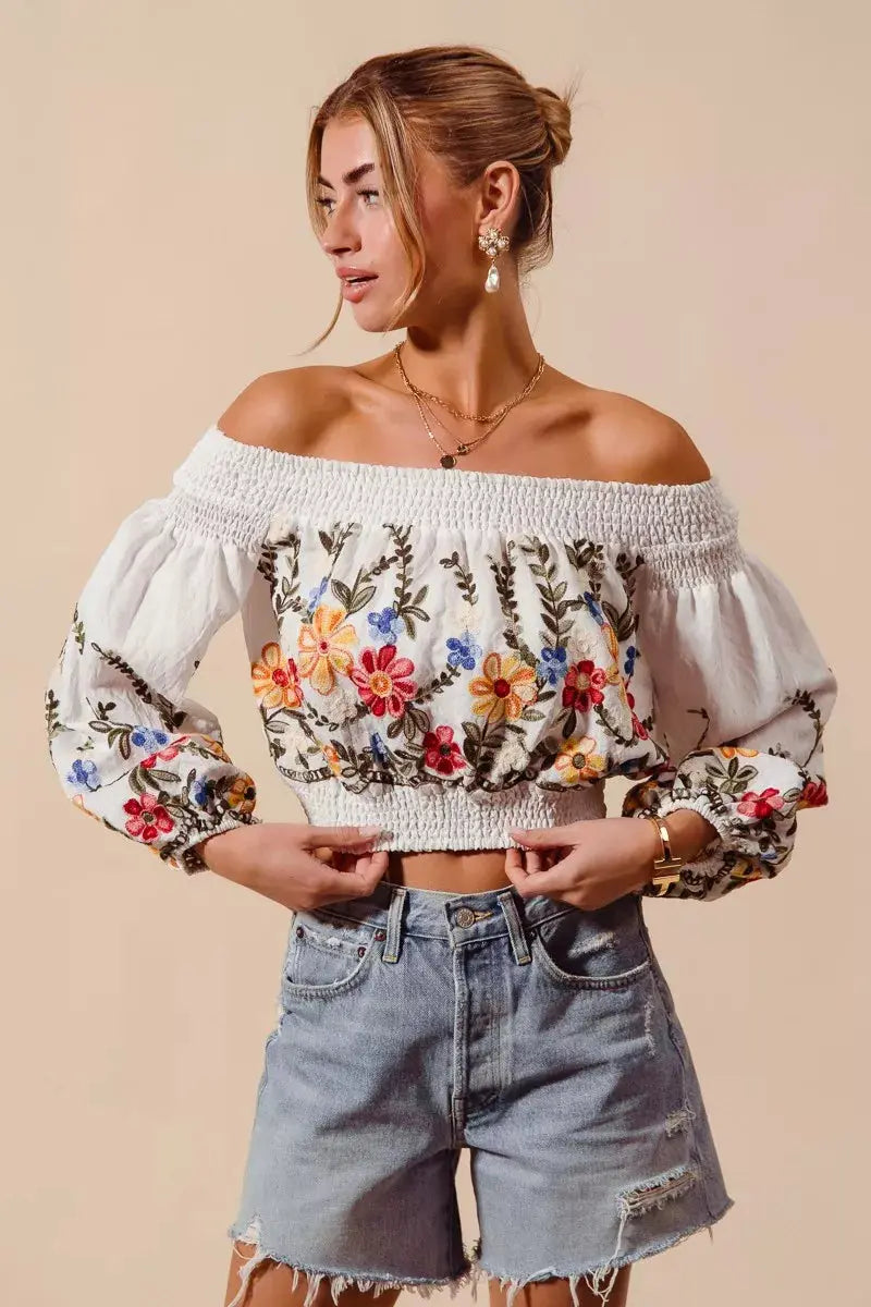 SO ME Floral Embroidered Off The Shoulder Crop Top