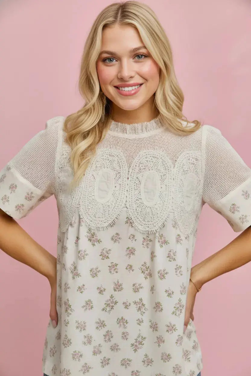 This floral print lace trim cotton blouse combines a delicate and romantic design. The intricate lace detailing adds a touch of elegance to the feminine floral pattern. Made from comfortable cotton fabric, it's perfect for casual wear with a stylish twist. Pair it with your favorite jeans or a skirt for a chic and effortless look. Embrace your inner femininity with this charming and versatile blouse!