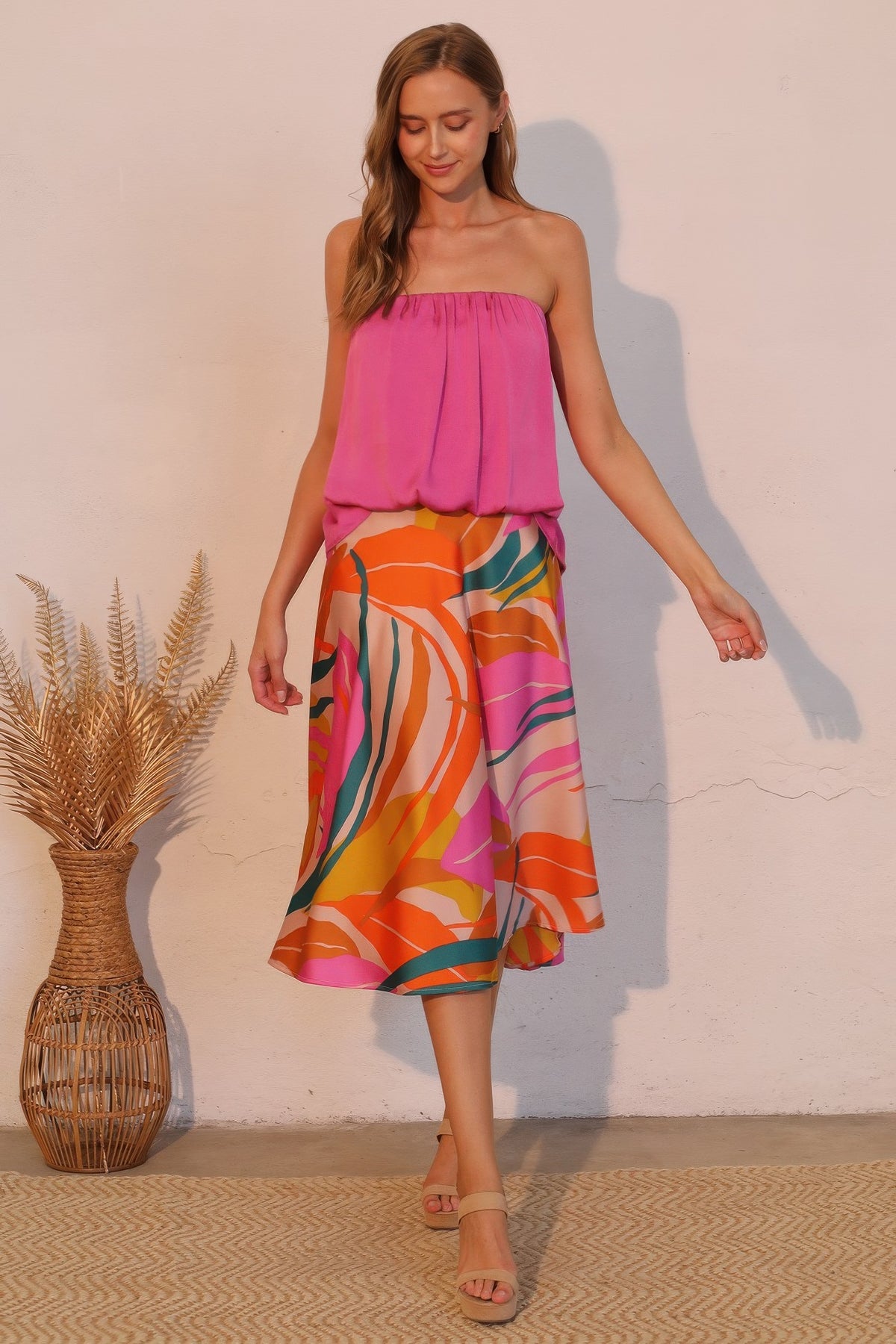 Vibrant and breezy, the Isla Tropical Satin Midi Swing Skirt brings bold color and effortless movement to any outfit. Crafted from glossy satin polyester, this skirt showcases the lush Isla Tropical print in a flowing midi silhouette that drapes beautifully with every step. The lightweight fabric offers an elegant sheen, while the swing cut adds playful dimension. Whether paired with the matching top or styled with a simple knit, this skirt delivers polished ease for warm-weather days or vacation-ready looks. Made in the U.S.A., it’s a standout piece with versatile appeal.