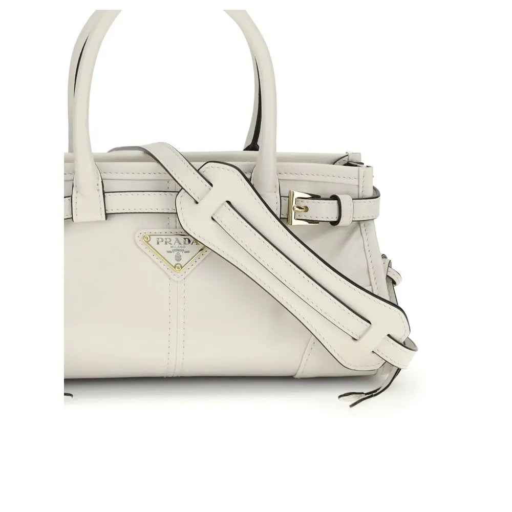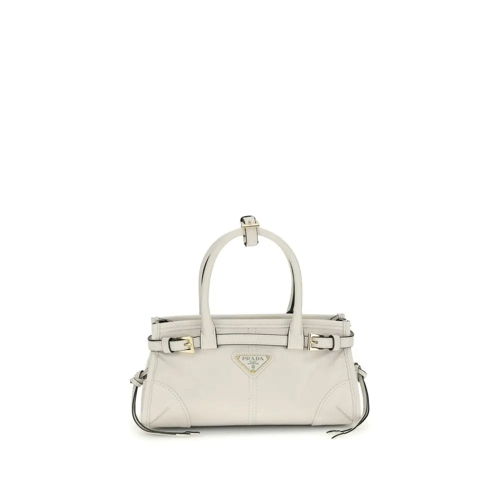 The Bonnie mini Handbag by Prada is a compact and versatile accessory defined by a modern and sophisticated design. Made of soft leather with a liquid, shiny finish, it is embellished with distinctive metal buckles and side laces that enhance its unique style. The model features an adjustable and removable leather shoulder strap, zipper closure and refined metal details. The enameled triangle logo on the front signs the brand’s iconic aesthetic, while the logoed nylon interior includes a practical zippered pocket. A perfect blend of contemporary elegance and functionality.